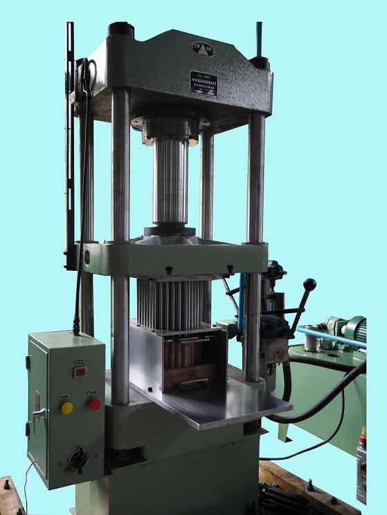 工作原理:壓制工作前,壓機(jī)模具處于開(kāi)放起始位置。將一組紙筒裝入盒子內(nèi),用補(bǔ)償釘板結(jié)合引沖板將紙筒固定于補(bǔ)償釘板上,抽離引沖板,用裝藥器定量將泥土兩次裝填送入釘板下紙筒內(nèi),將紙筒盒送入壓機(jī)模具內(nèi),定位后啟動(dòng)壓機(jī),在主缸作用下,上??焖傧乱?,觸到泥土?xí)r變?yōu)槁傧乱?,直至達(dá)到設(shè)定壓力,保壓延時(shí)退回,取出壓好的紙筒,完成一個(gè)工作循環(huán)。