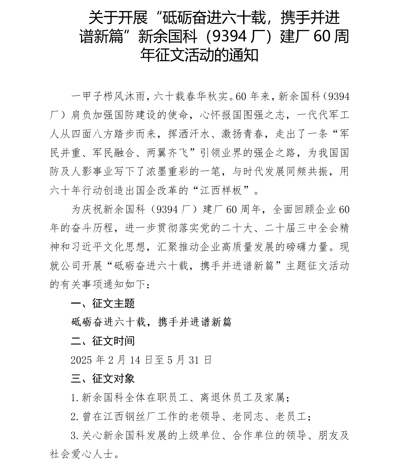 關(guān)于開展“砥礪奮進(jìn)六十載,攜手并進(jìn) 譜新篇”新余國科(9394廠)建廠60周年征文活動的通知