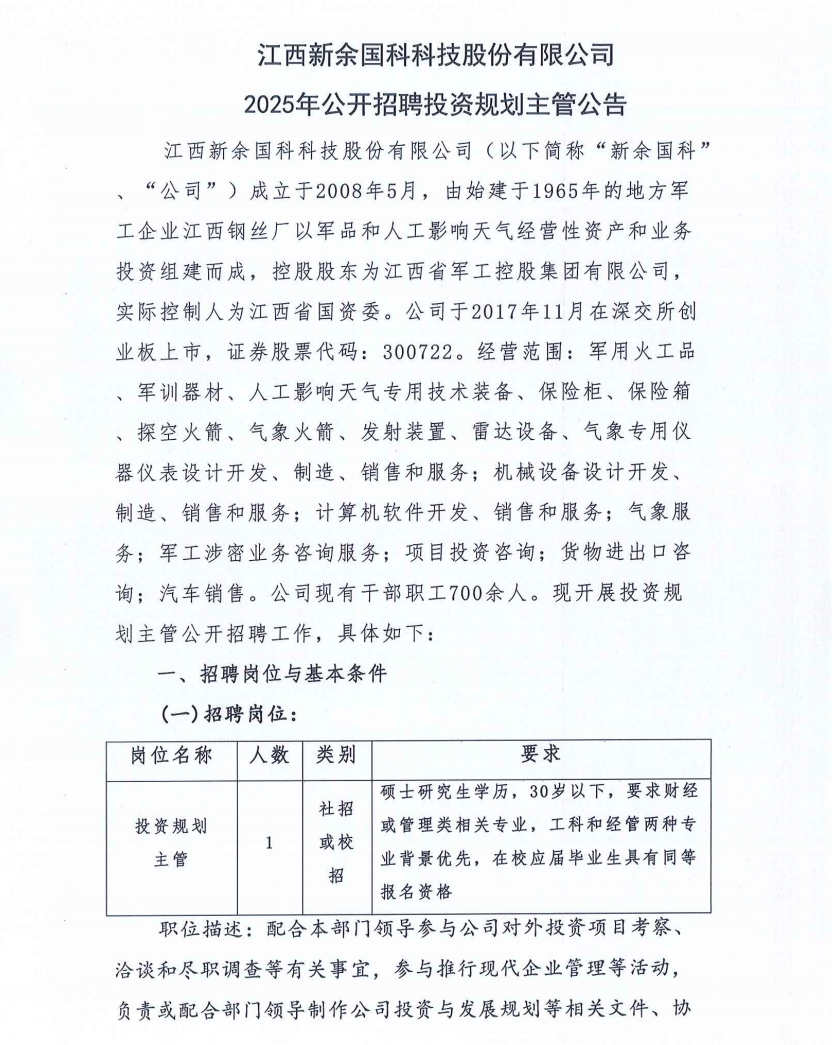 江西新余國(guó)科科技股份有限公司 2025年公開(kāi)招聘投資規(guī)劃主管公告
